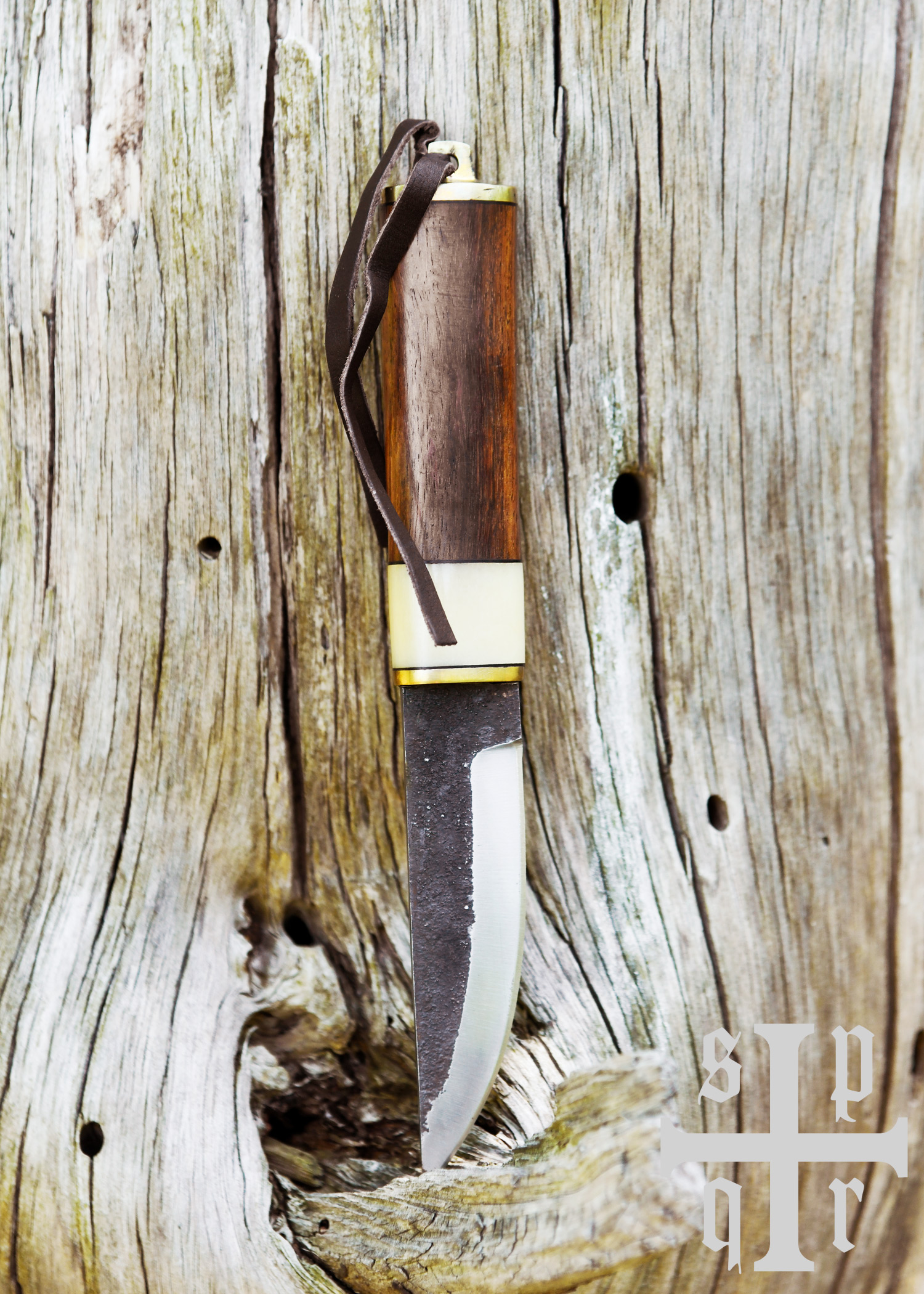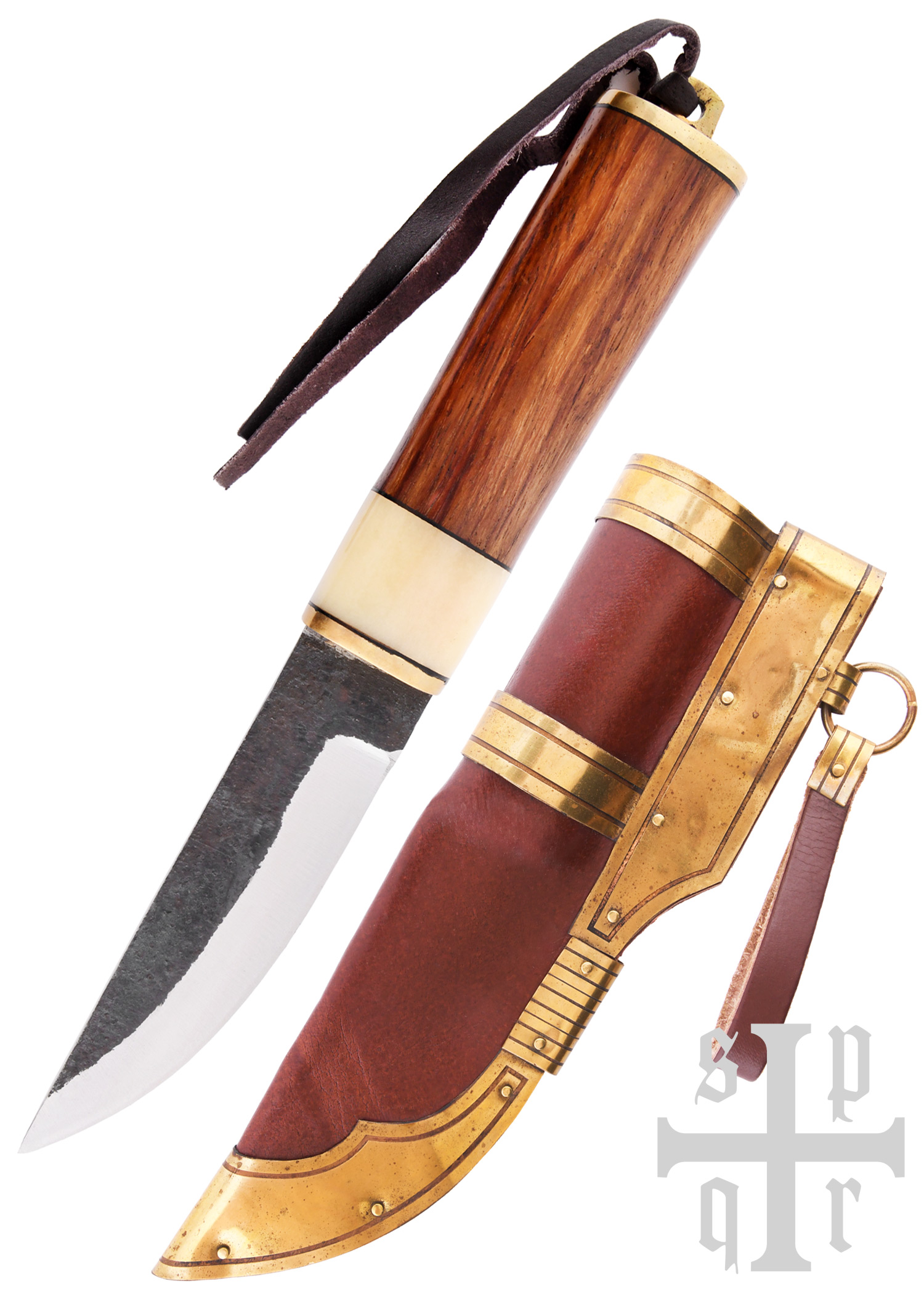 Dieses hochwertige wikingerzeitliche Messer wurde nach einem Originalfund aus Gotland (Schweden, ca. 9./10. Jh.) handgefertigt. Die handgeschmiedete Karbonstahklinge wurde scharf geschliffen und die schmiedeschwarze Zunderschicht, die auf dem Klingenspiegel belassen wurde, verleiht dem Messer eine rustikale Optik. Wie bei vielen typischen gotländischen Messern aus der Wikingerzeit schließt der Walnussgriff zur Klinge hin mit einer Lage aus Knochen und einer Zwinge aus Messing ab. Die Griffkappe mit praktischer Öse (zur Aufnahme eines Tragebands oder zum bequemen Herausziehen des Messers aus der Scheide) ist ebenfalls aus Messing gefertigt. Die wunderschöne Scheide aus gegerbtem Leder mit reich verzierten Messingbeschlägen ist mit einem Tragring samt Gürtelschlaufe ausgestattet. So lässt sich das Wikinger-Messer bequem am Gürtel tragen (max. Gürtelbreite ca. 5 cm).