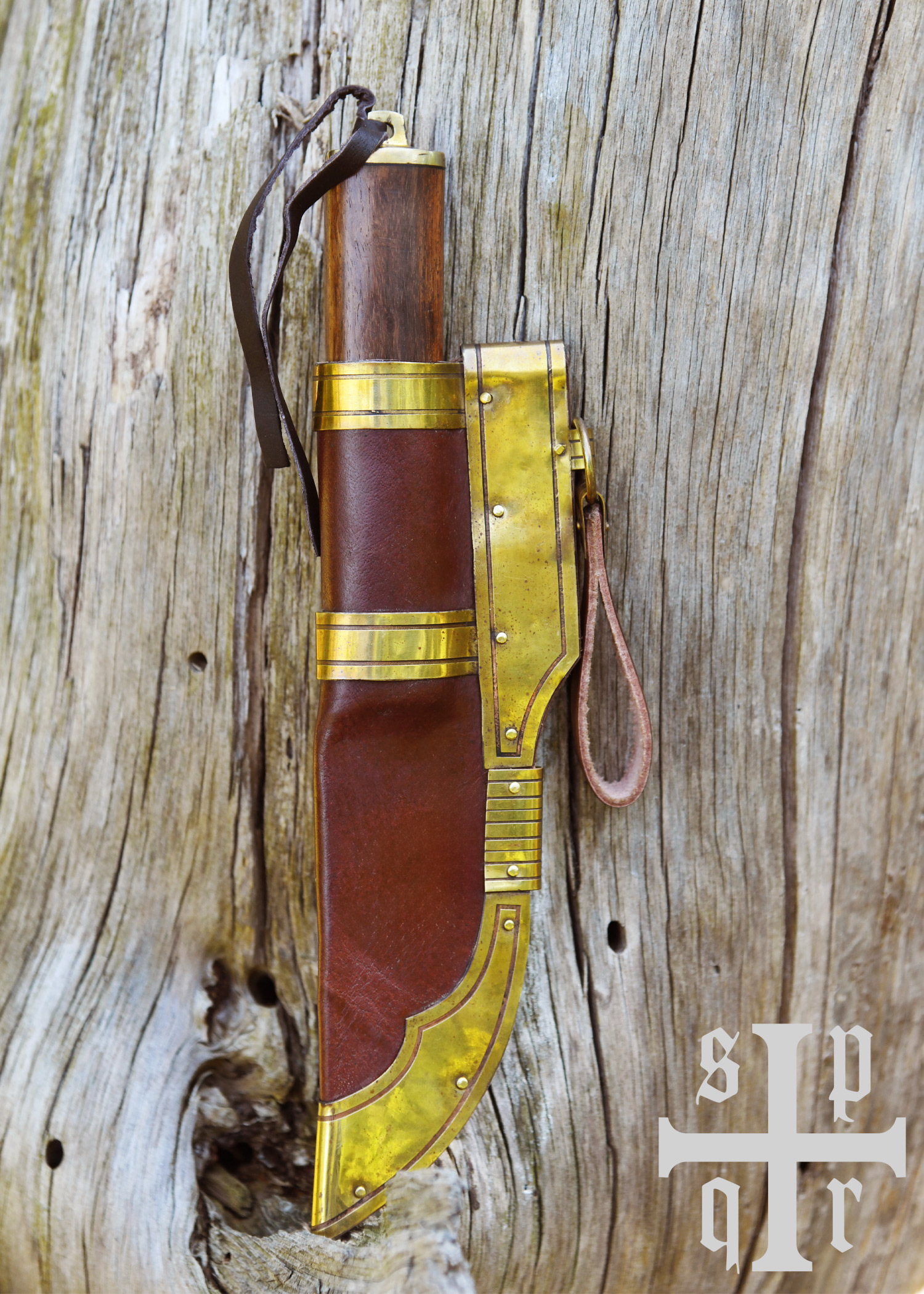 - Scheide aus Leder und Messing mit Tragring und Gürtelschlaufe