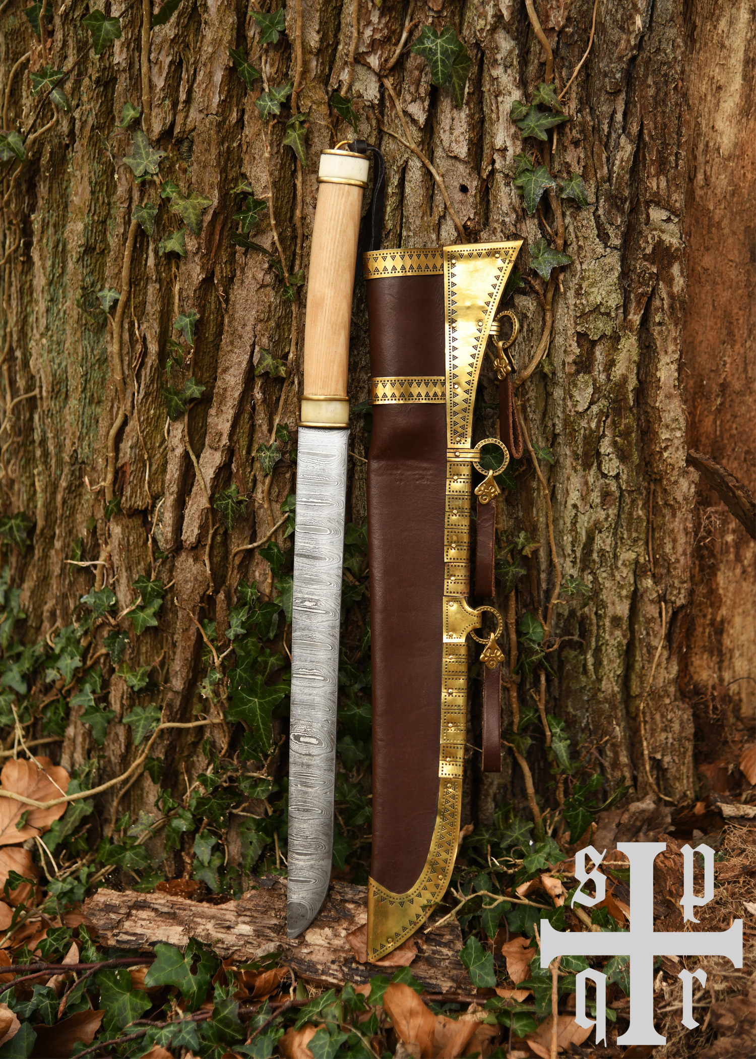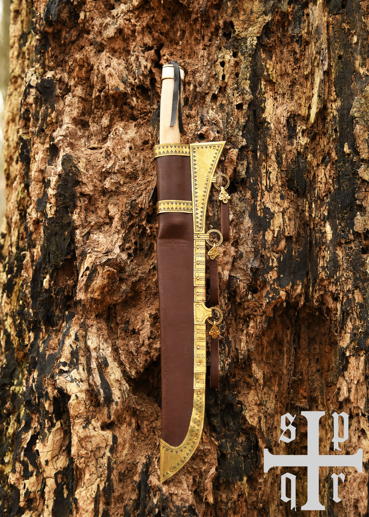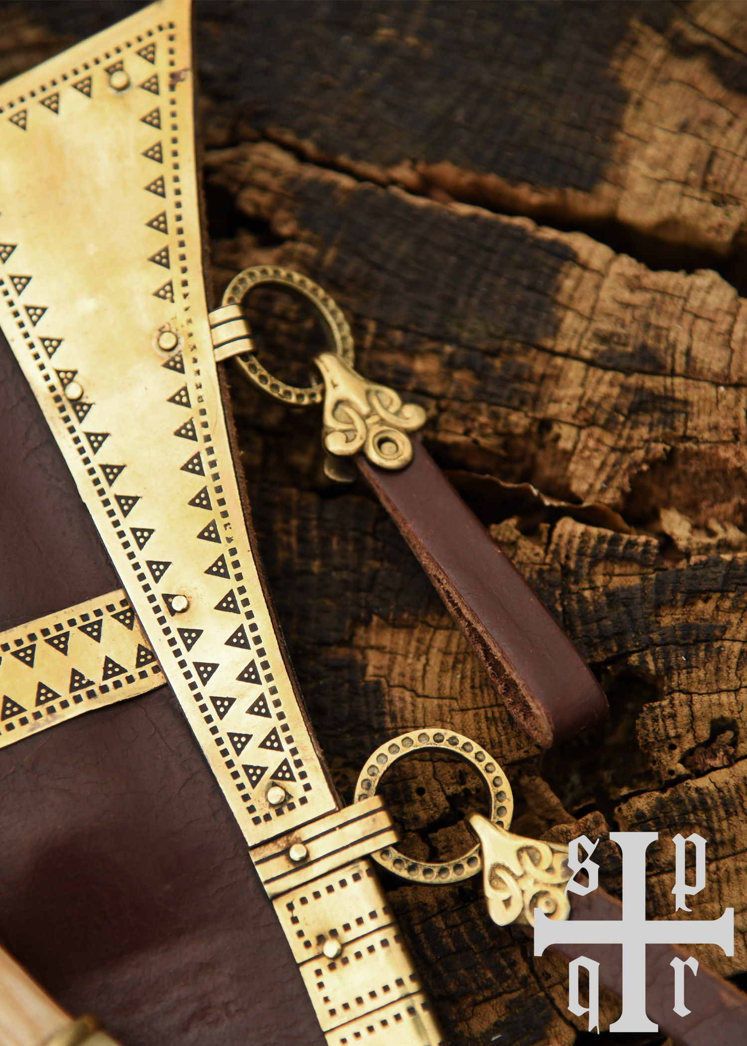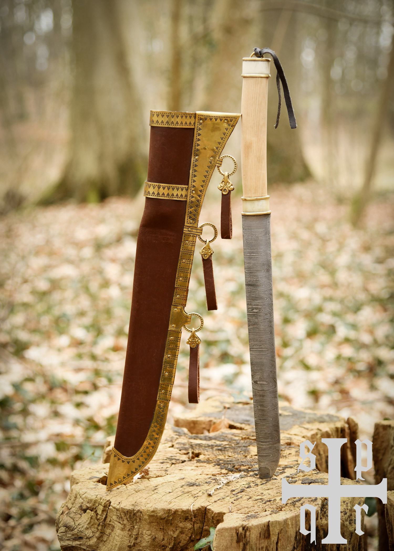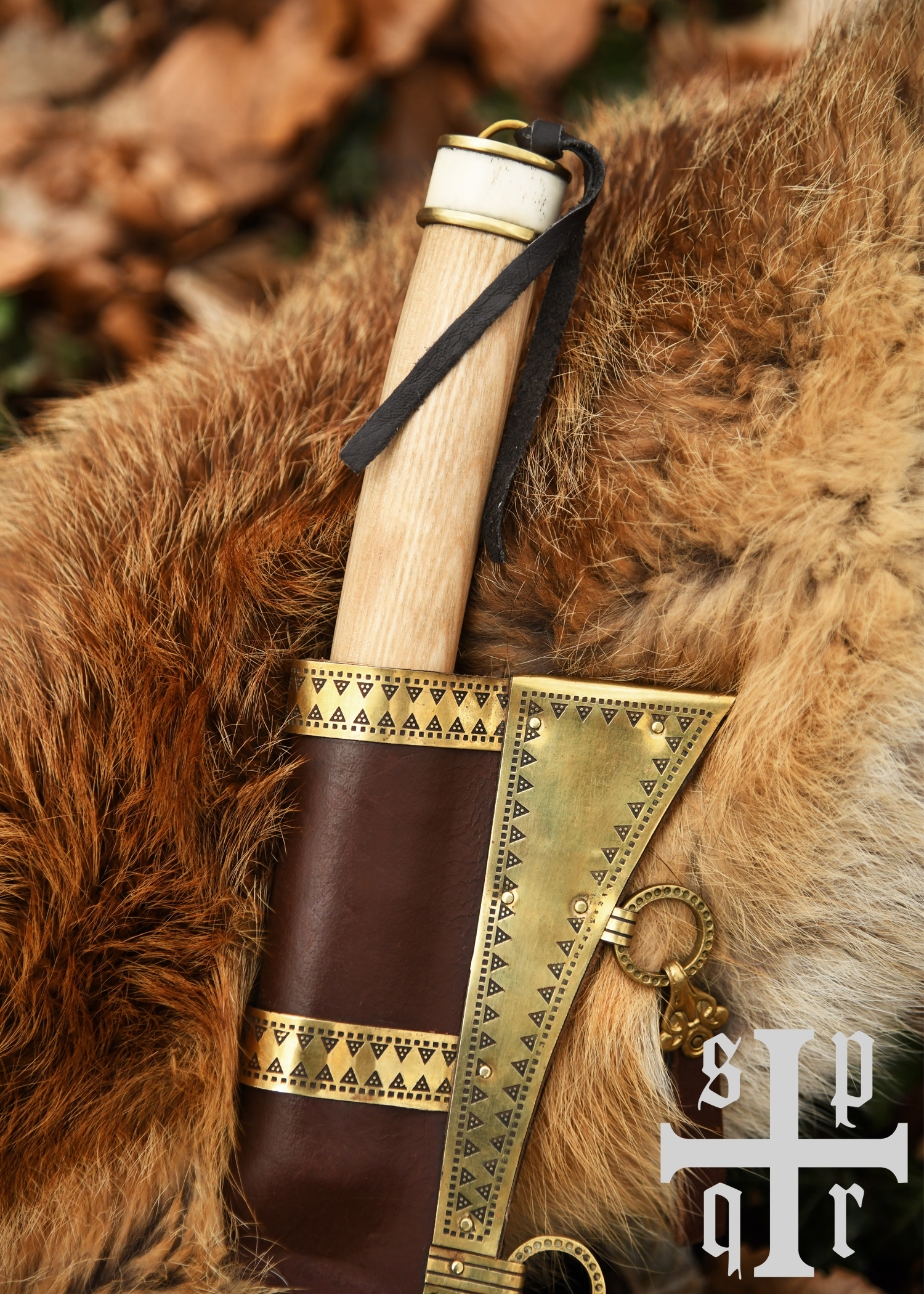 Die wunderschöne Lederscheide ist mit stilechten Messingbeschlägen verziert. Dank dreier an Messingringe angebrachten Lederschlaufen lässt sich dieser Sax im typischen Wikingerstil horizontal am Gürtel tragen. Die stilisierten Tierköpfe, die die Trageschlaufen schmücken, sind Funden aus Björkö/Birka (Schweden) nachempfunden.