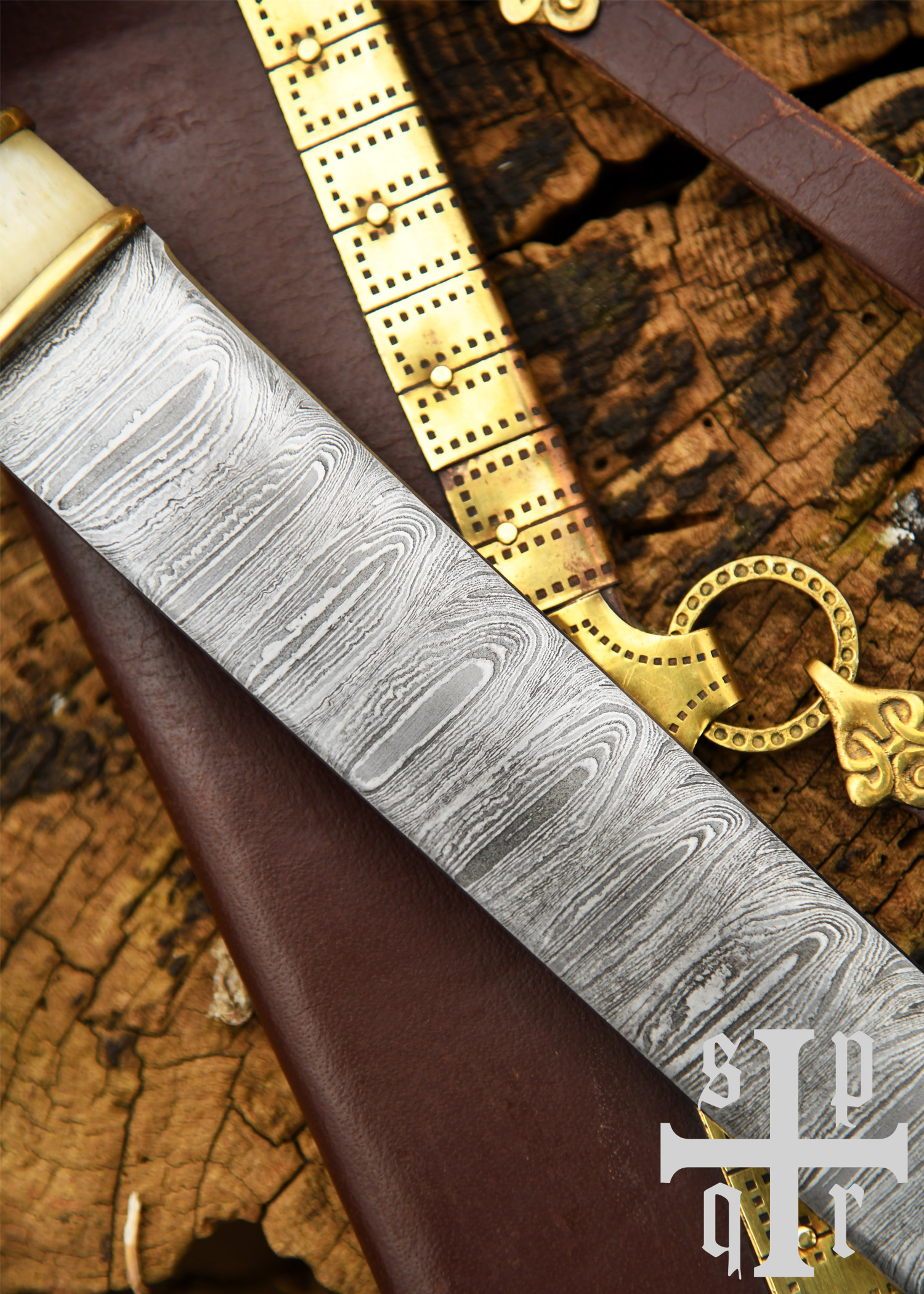 Dieses wikingerzeitliche Messer mit Klinge aus 256-Lagen-Damaststahl* basiert auf einem auf das 11. Jh. datierten baltischen Kriegs- bzw. Saxmesser, welches in einem Grabhübel in Priekuli-Gugeri (Lettland) gefunden wurde. Der Holzgriff schließt auf beiden Seiten mit Knochen- und Messingringen ab. Er hat einen ovalen Querschnitt und liegt somit fest in der Hand. Die Griffkappe aus Messing ist mit einer praktischen Fangriemenöse ausgestattet (Lederband ist inbegriffen).