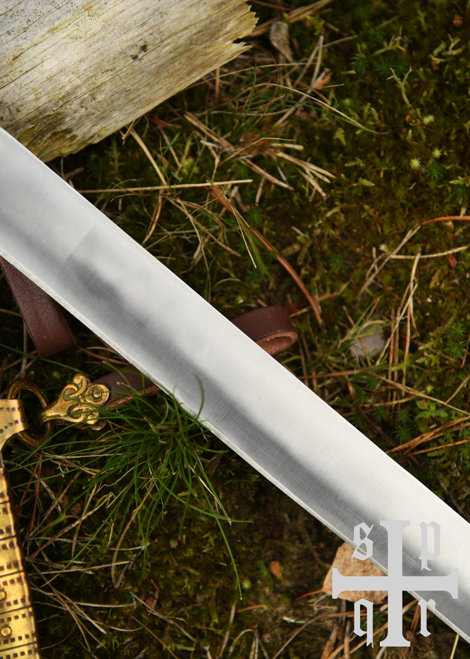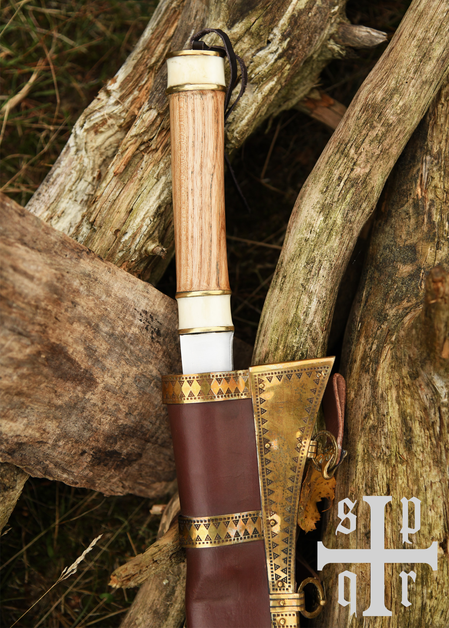 Dieses wikingerzeitliche Messer mit Klinge aus Kohlenstoffstahl basiert auf einem auf das 11. Jh. datierten baltischen Kriegs- bzw. Saxmesser, welches in einem Grabhübel in Priekuli-Gugeri (Lettland) gefunden wurde. Der Holzgriff schließt auf beiden Seiten mit Knochen- und Messingringen ab. Er hat einen ovalen Querschnitt und liegt somit fest in der Hand. Die Griffkappe aus Messing ist mit einer praktischen Fangriemenöse ausgestattet (Lederband ist inbegriffen).