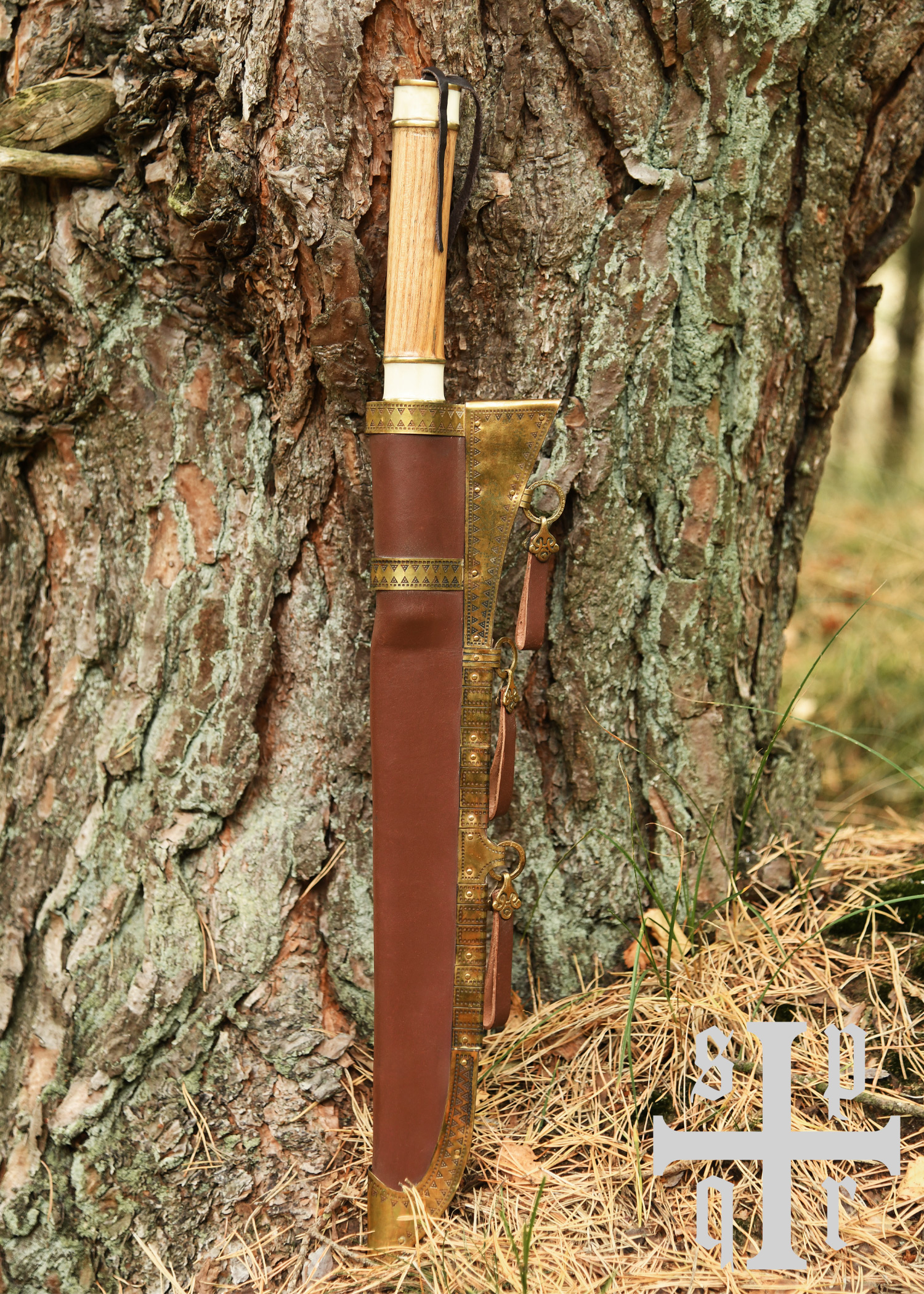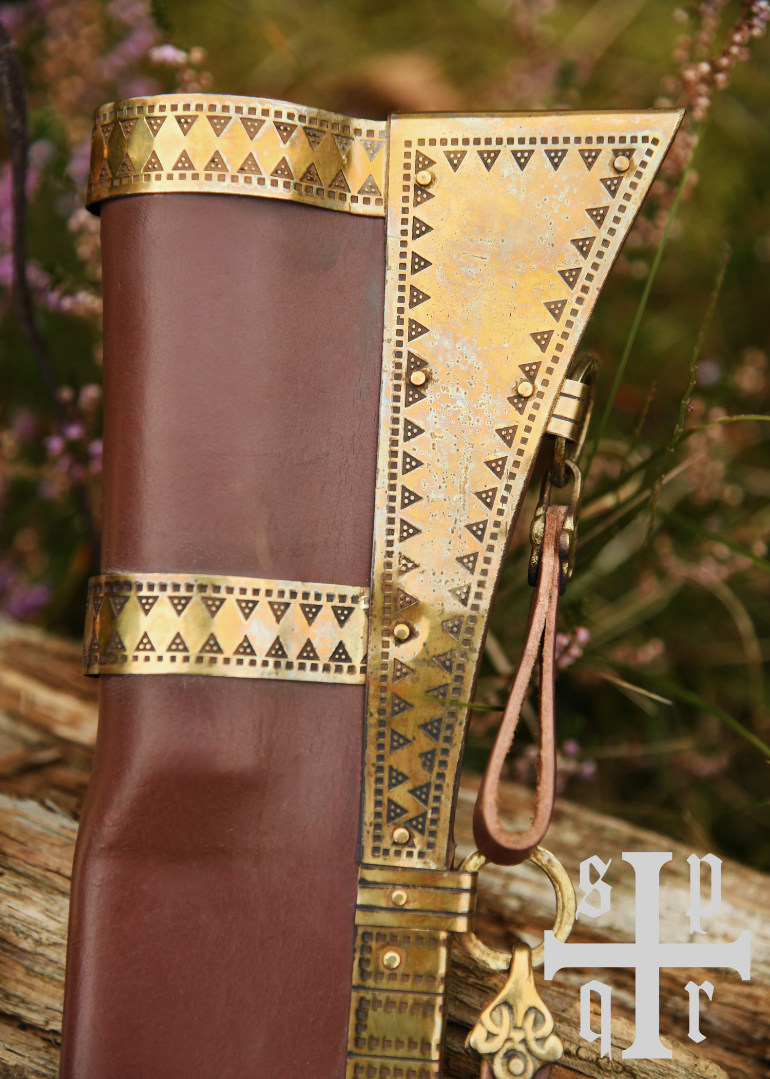 Die wunderschöne Lederscheide ist mit stilechten Messingbeschlägen verziert. Dank dreier an Messingringe angebrachten Lederschlaufen lässt sich das Messer im typischen Wikingerstil horizontal am Gürtel tragen. Die stilisierten Tierköpfe, die die Trageschlaufen schmücken, sind Funden aus Björkö/Birka (Schweden) nachempfunden.