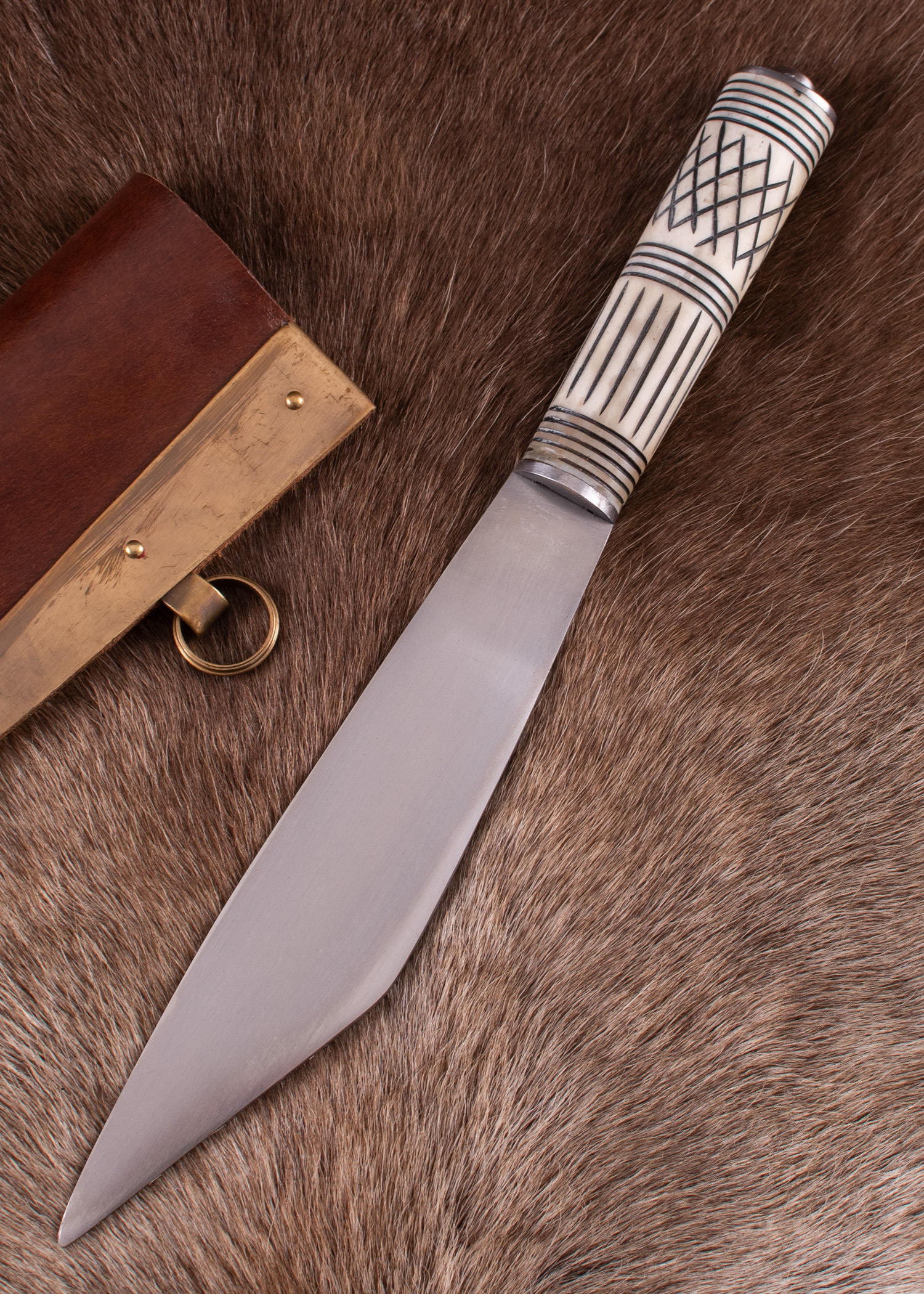 Im Lieferumfang enthalten ist eine Scheide aus kräftigem, vegetabil gegerbtem Leder mit Beschlägen – Verstärkungsplatten, Nieten und zwei Aufhänge-Ringen – aus Messing mit Antik-Finish.