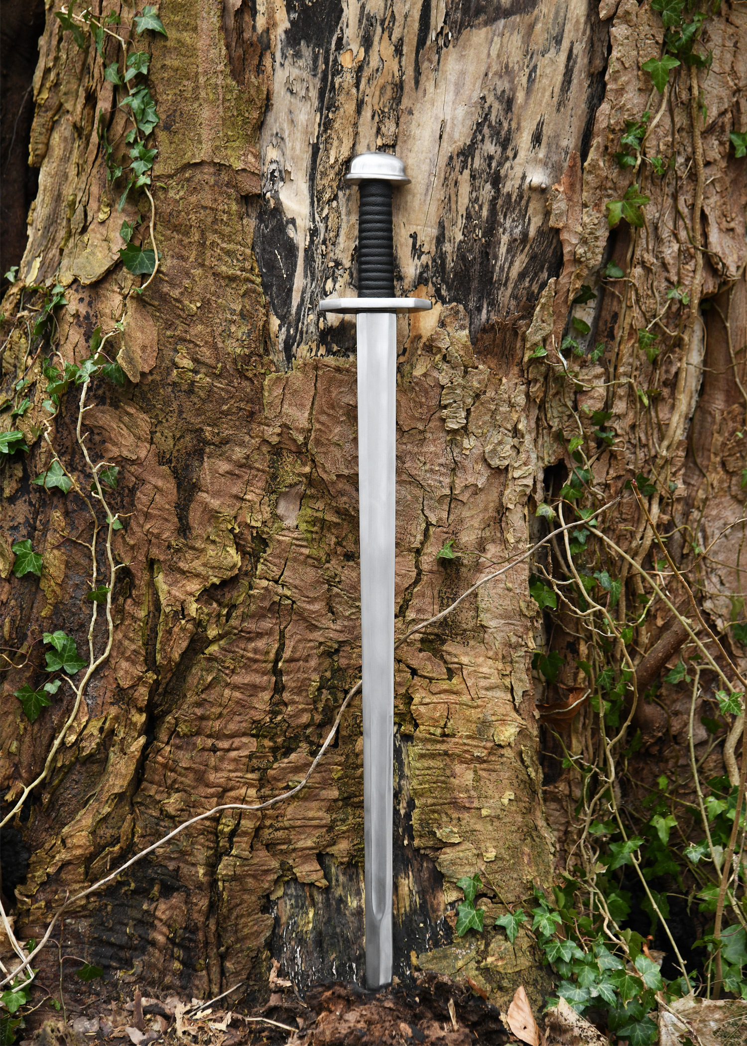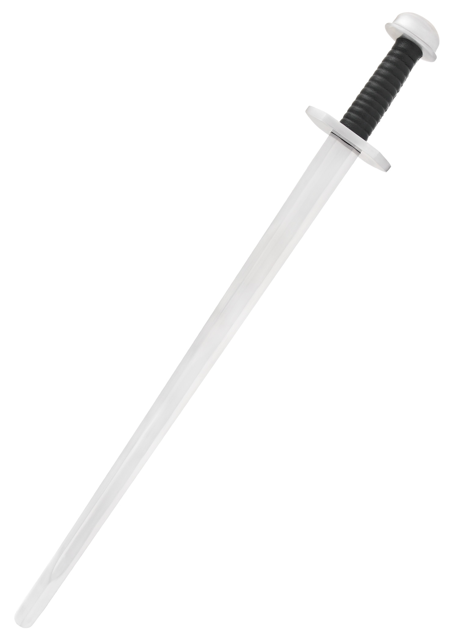 Nachbildung eines typischen Wikingerschwertes aus dem 9. und 10. Jahrhundert. Die Kohlenstoffstahlklinge dieses Schwertes ist bis zum Knauf durchgeschmiedet und am Griffende mit diesem verschraubt. Die Schneide ist stumpf und die Spitze wurde abgerundet. Knauf und Parierstange bestehen aus Stahl.