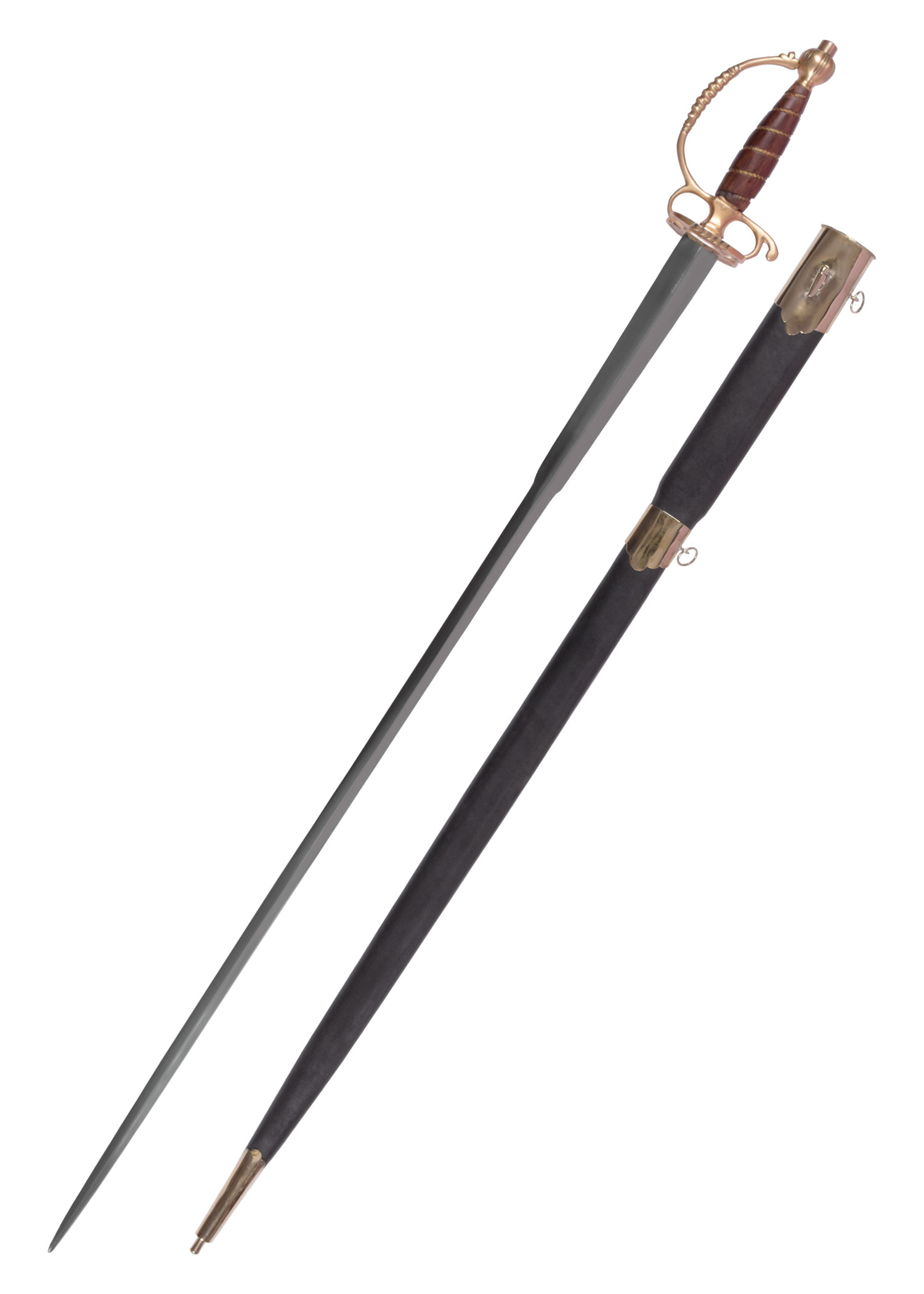 Diese Nachbildung des zivilen Degens besitzt eine Klinge aus EN45 Federstahl mit dreieckigem Querschnitt, welche nicht geschärft ist. Das Parierelement sowie der geschwungene Handschutz bestehen aus Messing, mit einem Griff aus Holz, welcher mit Messingdraht umwickelt ist.